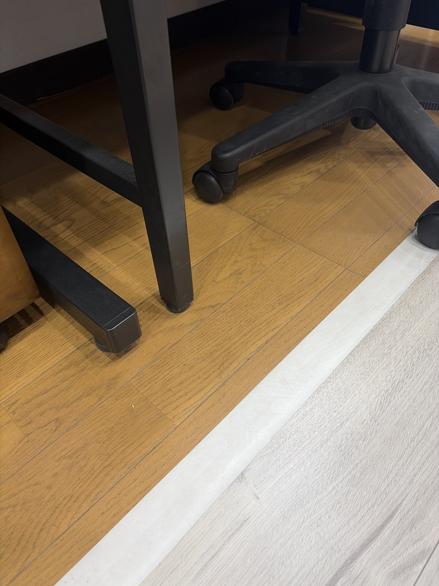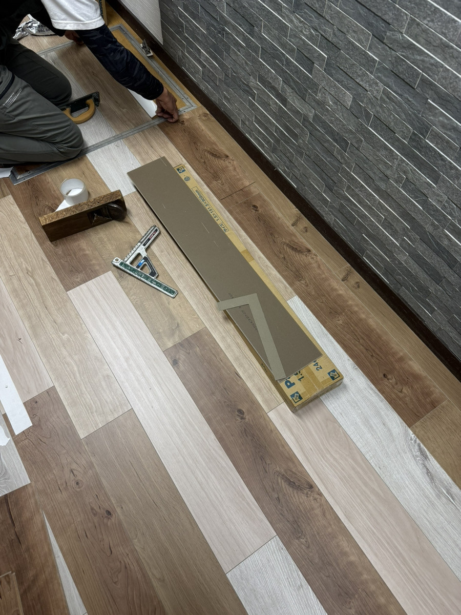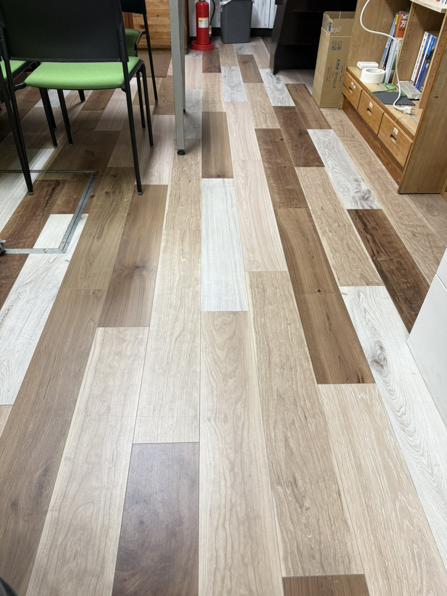 以前はこのような茶色の床でしたが……このように変わりました!!パナソニックのウスイータという商品です。貼るだけなので騒音を気にせずリフォームが可能です。端も切って合わせることができます。1.5㎜と薄いのでドアの開け閉めもできちゃいます。是非お気軽にご相談ください૮ ・ﻌ・ა